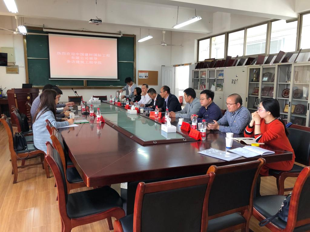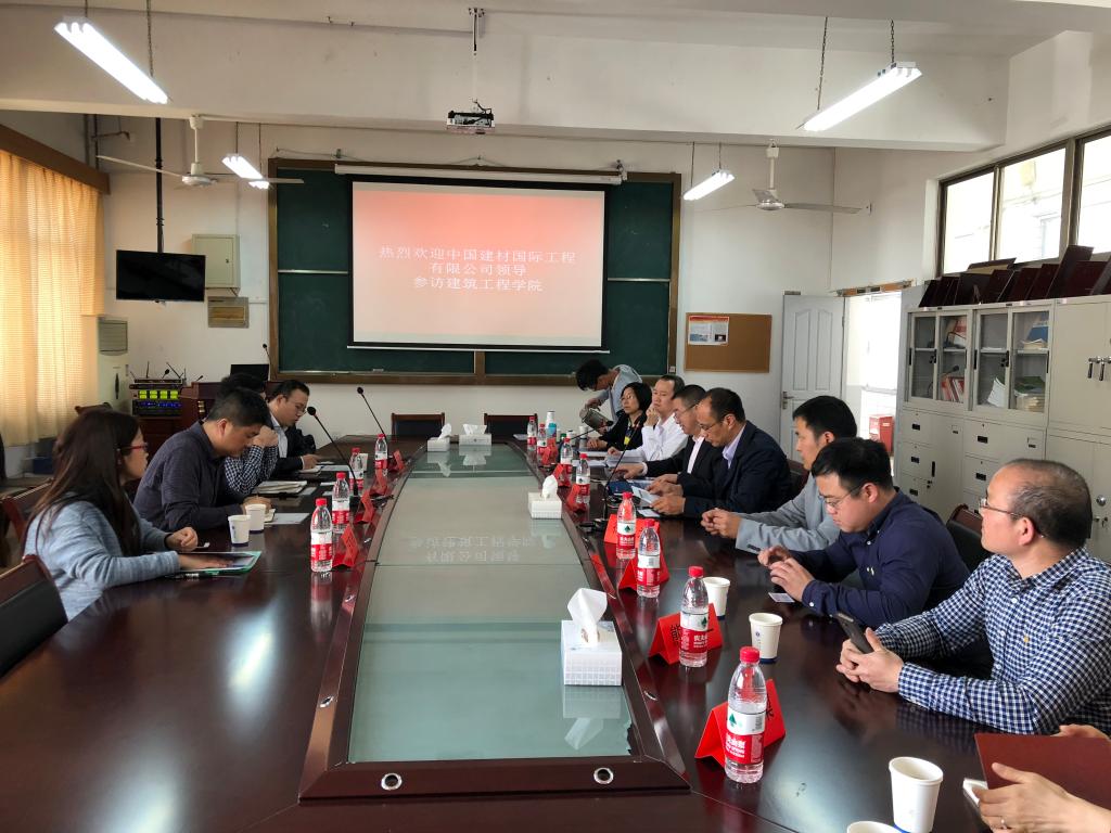 3月30日下午,中国建材国际工程集团有限公司吕宏炜副总裁一行四人参访线上娱乐城 。四位客人在参观建筑工程实验中心后,在生化学院院长、中澳研究院刘小明副院长主持下,与线上娱乐城 孙德发副院长等八位老师在建工楼319会议室进行了会谈,在会上,中国建材国际工程集团有限公司、线上娱乐城 、中澳先进材料与制造研究所的相关同志作了工作介绍,双方参会人员进行了深入交流,并对共同感兴趣的项目进行了对接洽谈。