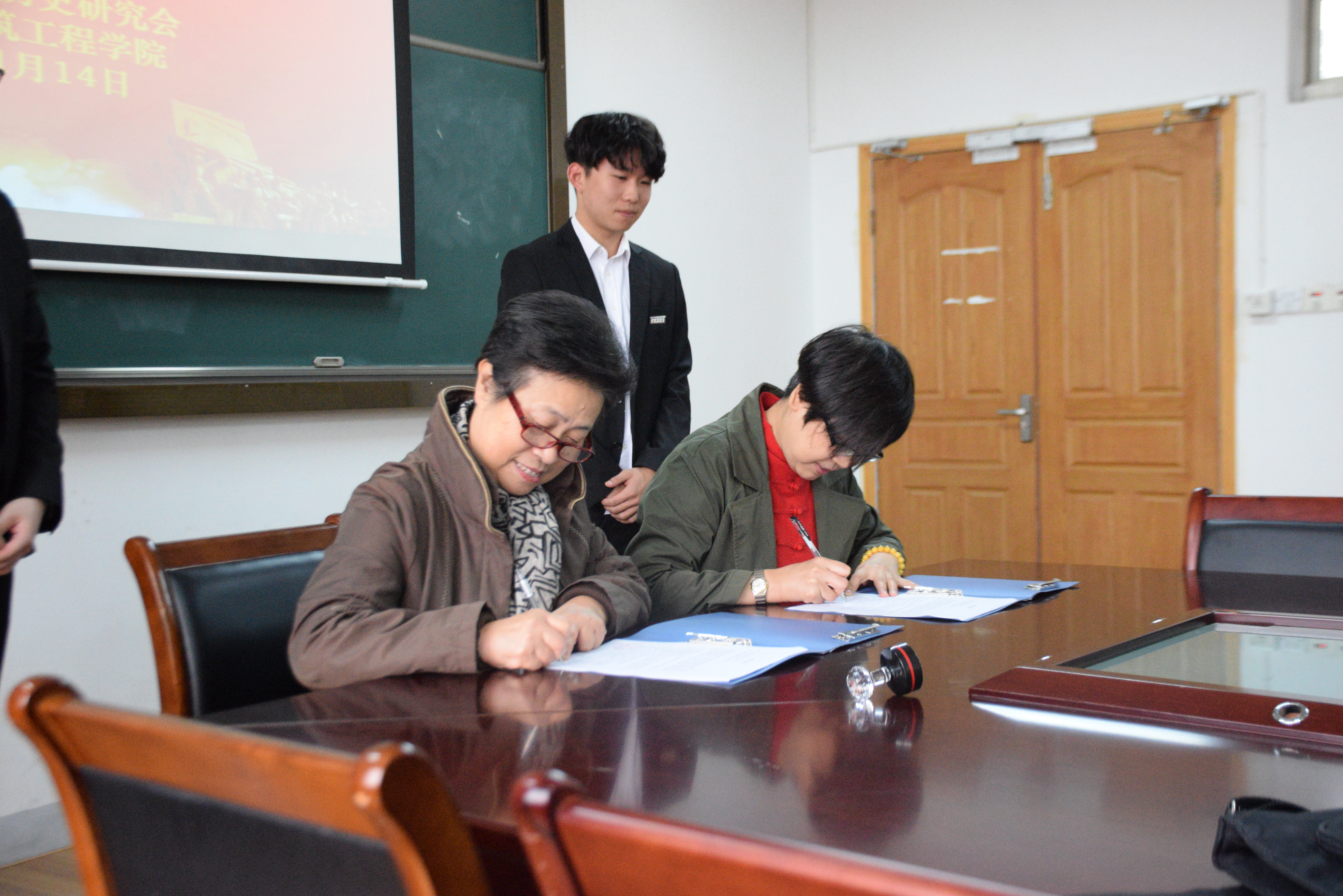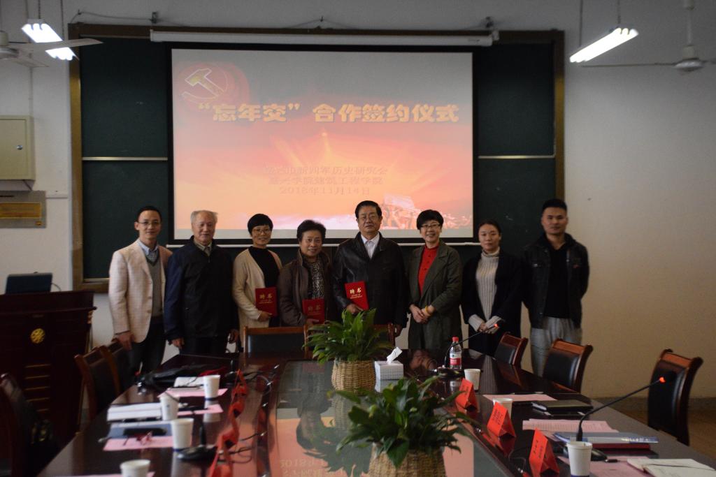 与嘉兴市新四军历史研究会于11月14日下午在建工楼319会议室进行了“忘年交”合作签约仪式,就合作开展大学生爱国主义教育达成了协议。