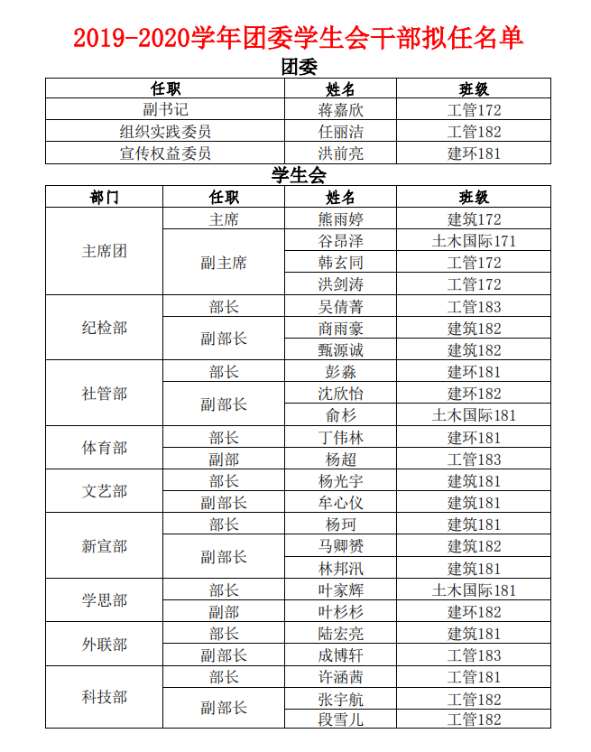 经竞职答辩,结合学院团委考核,现将嘉兴学院线上娱乐城 2019-2020学年团委学生会拟任干部名单公布如下: