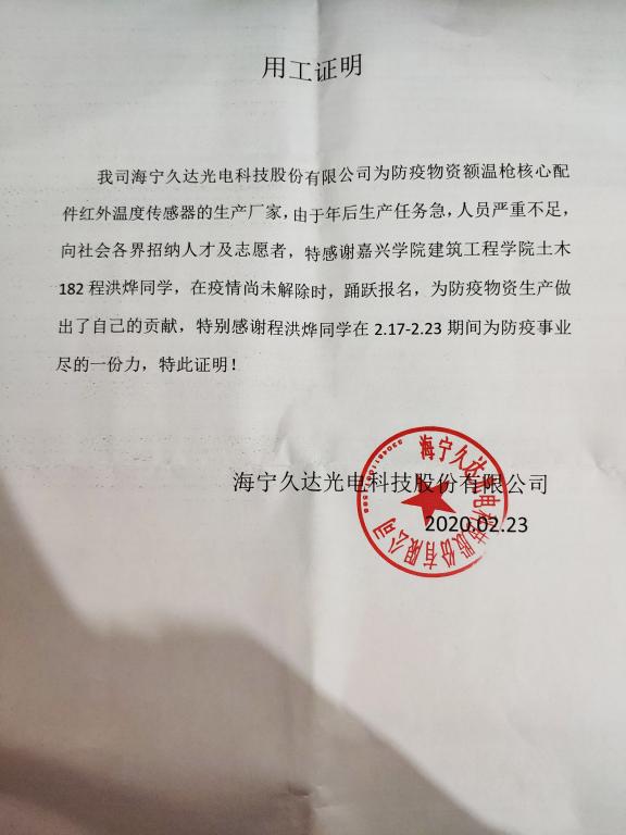 “2020年初的新型冠状病毒疫情让很多企业都面临复工的困扰。身为一名嘉兴籍的大学生,主动去帮助本市的企业复工是一件荣幸的事,于是我申请来到了海宁市久达光电有限公司做临时工。在工作期间,让我我懂得了要有所成功,就要自己亲自去做,亲自去总结做的过程中所发生的种种困难,既要去分析,又要有坚强的毅力。”土木工程182班学生程洪烨这样说到。