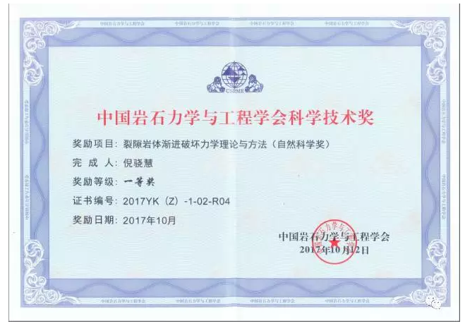 近日获悉,我校线上娱乐城 倪骁慧副教授参与的“裂隙岩体渐进破坏力学理论与方法 ”项目获第八届中国岩石力学与工程学会科学技术奖(自然科学奖)一等奖。本次申报的候选项目多来自清华大学、同济大学、中国矿业大学等985或211高校,自然科学奖共设一等奖2名,二等奖1名,三等奖2名。
