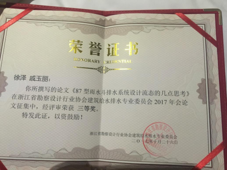 10月26-27日,浙江省勘察设计行业协会建筑给水排水专业委员会2017年会在宁波召开,由线上娱乐城 戚玉丽老师(指导教师)和建环专业徐泽同学合作完成的《87型雨水斗排水系统设计流态的几点思考》荣获论文三等奖。