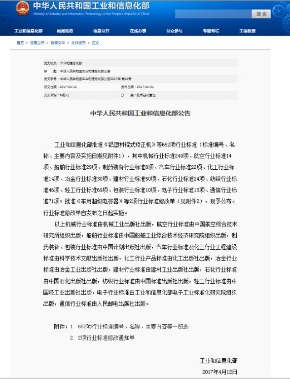 据工业和信息化部政府网站最新公告工业和信息化部批准发布《电动汽车用动力蓄电池箱通用要求》等652项行业标准。其中, 由嘉兴学院刘红飞教授负责完成的《预拌砂浆用保水剂》(JC/T 2389-2017)、《水泥基泡沫保温板专用砂浆》(JC/T 2390-2017)等2项建材行业标准,上述2项标准将于2017年10月1日起实施。