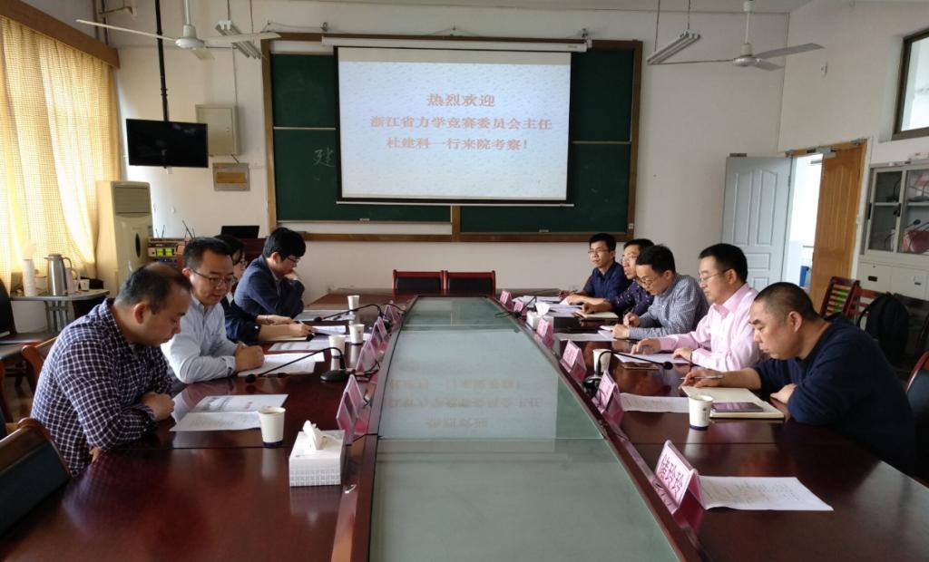 进行考察,就2019年第八届浙江省大学生力学竞赛的筹备工作进行了考察与指导。教务处江平主任、学院孙德发副院长、王辉副书记、储玲玲主任、朱杰博士、倪骁慧副主任参加了会议。会议上,孙院长对杜主任一行来访表示热情欢迎,并向来宾介绍了我校相关情况。杜主任高度赞扬了我校师生在历次竞赛中的突出表现,表达了共同办好这次竞赛的良好愿望。老师们就具体竞赛事宜进行了详细的咨询与交流,并对比赛场地进一步进行现场踏勘、确认。(倪骁慧 供稿;孙德发 审稿)