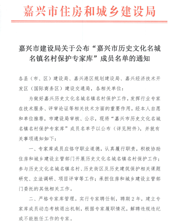 据悉,本次专家库的建设是为了做好嘉兴历史文化名城名镇名村保护工作,更好发挥行业专家在技术服务、评审论证等相关技术方面的重要作用。入选的专家要协助住房和城乡建设主管部门开展历史文化名城名镇名村保护工作,参与历史文化名城名镇名村、历史街区及历史建筑保护相关课题研究、立法调研、项目评审等工作。