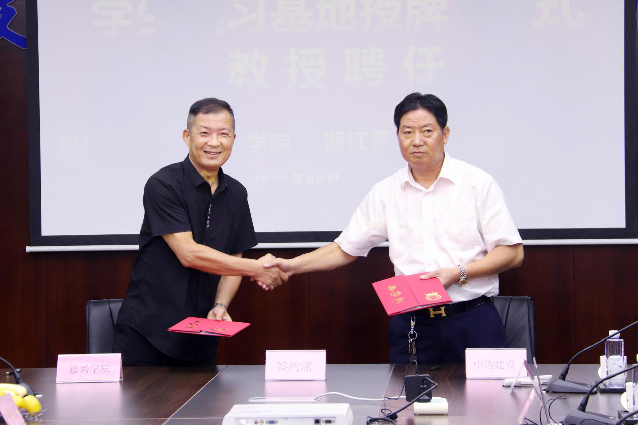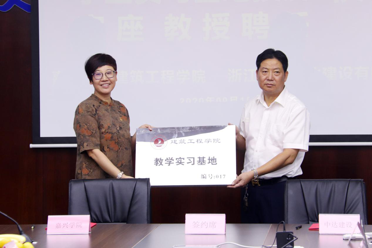 仪式上,由马嵘院长宣读客座教授聘任书,并为中达建设常务副总经理潘雪明颁发客座教授聘书;校企合作协议由马嵘院长与浙江嘉兴中达建设有限公司总经理肖国生共同签订;院党委书记费锦红向浙江嘉兴中达建设有限公司总经理肖国生颁授实习基地牌匾。仪式由中达建设行政办主任姜小明主持。