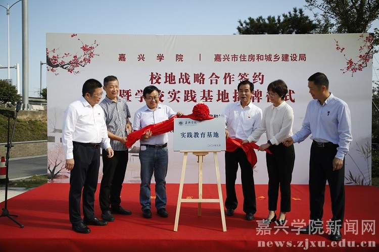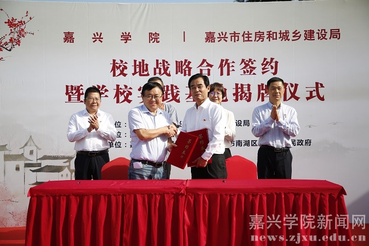 与嘉兴市住房和城乡建设局校地合作签约暨学校实践基地揭牌仪式在嘉兴市南湖区大桥镇胥山村举行。副校长胡俊云,院长马嵘,南湖区政府副区长张芳军,市建设局局长应志敏、党委副书记陈胜、副局长金洪良出席仪式。