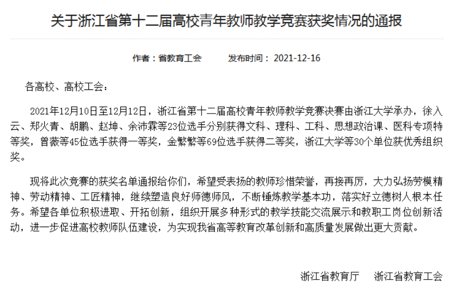 2021年12月10日-12日,由省教育厅、省教育工会主办,浙江大学承办的浙江省第十二届高校青年教师教学竞赛圆满落幕。为适应疫情防控新常态,本届组委会采用线上竞赛的方式,共有来自全省68所高校的137名青年教师在线竞技,角逐文科、理科、工科、医科和思政等五个组别的奖项。线上娱乐城