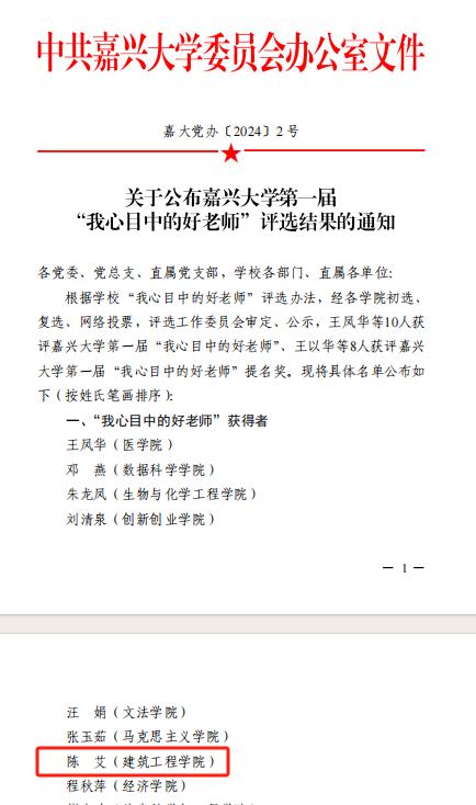 近日,线上娱乐城 工程管理系陈艾老师经初选、复选、网络投票,荣获嘉兴大学第一届“我心目中的好老师”称号。