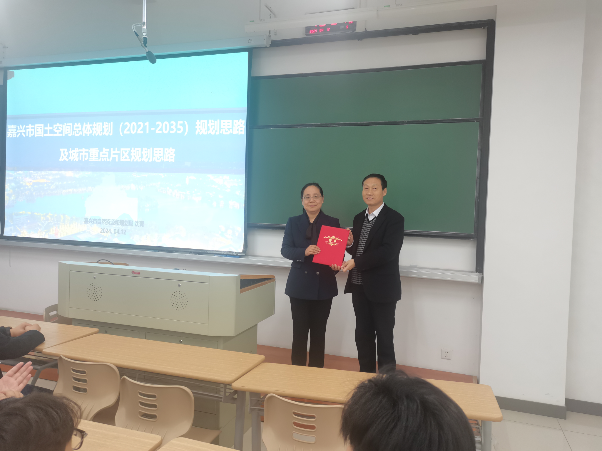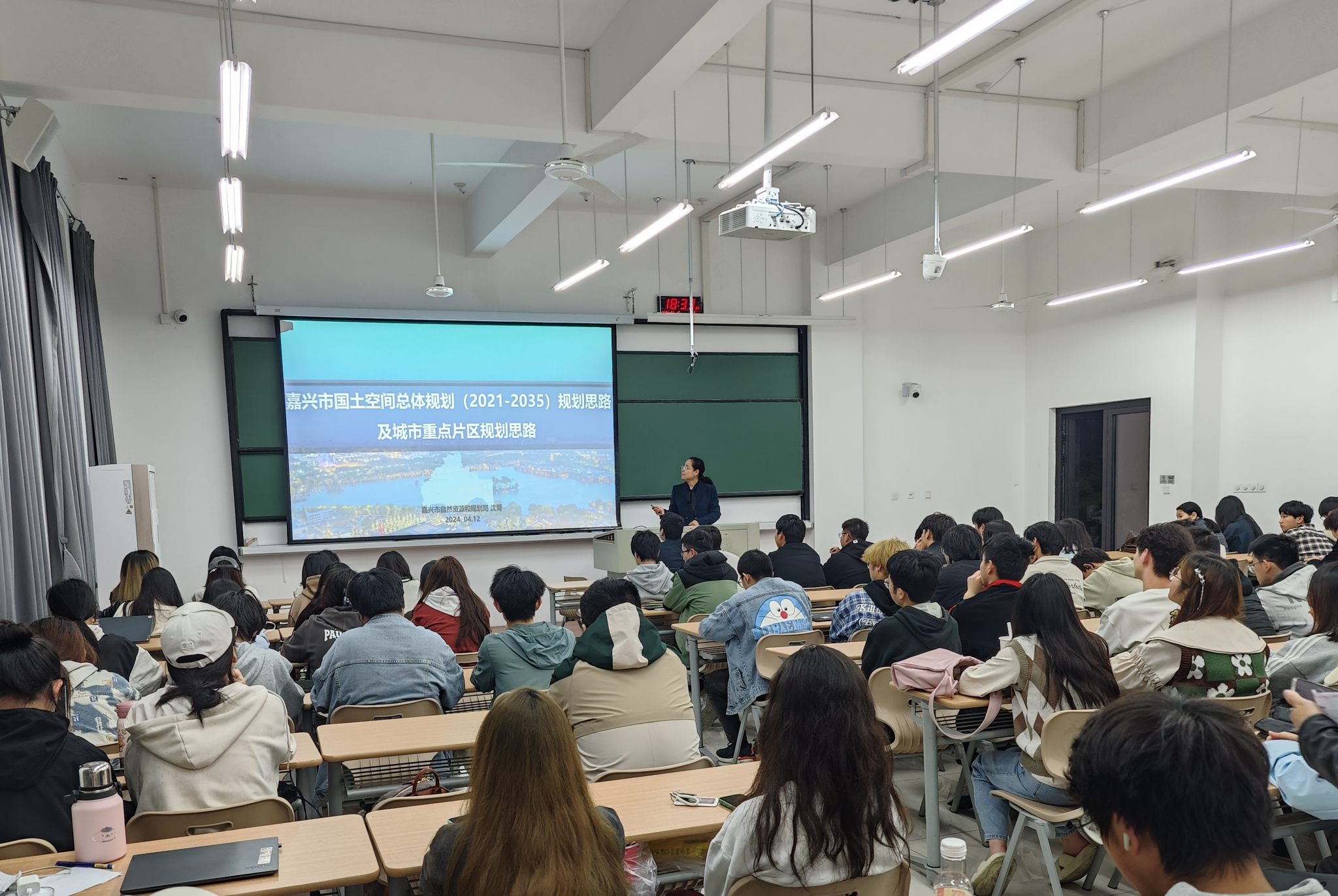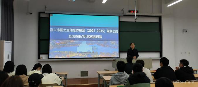 受聘仪式结束后,沈菁做主题为“嘉兴市国土空间总体规划(2021-2035)规划思路及城市重点片区规划思路”的学术报告。报告通过深入浅出的内容,从嘉兴市国土空间总体规划的历程、概况、发展目标、空间格局、陆海统筹、区域一体化、综合交通和基础设施体系、历史文化保护和特色风貌、自然资源保护和利用、中心城区规划、规划实施等11各方面为师生们展现了嘉兴未来发展的宏大愿景,让师生对嘉兴有了更多的了解和认知,也为同学们心里埋下了一颗热爱专业和热爱嘉兴的种子。