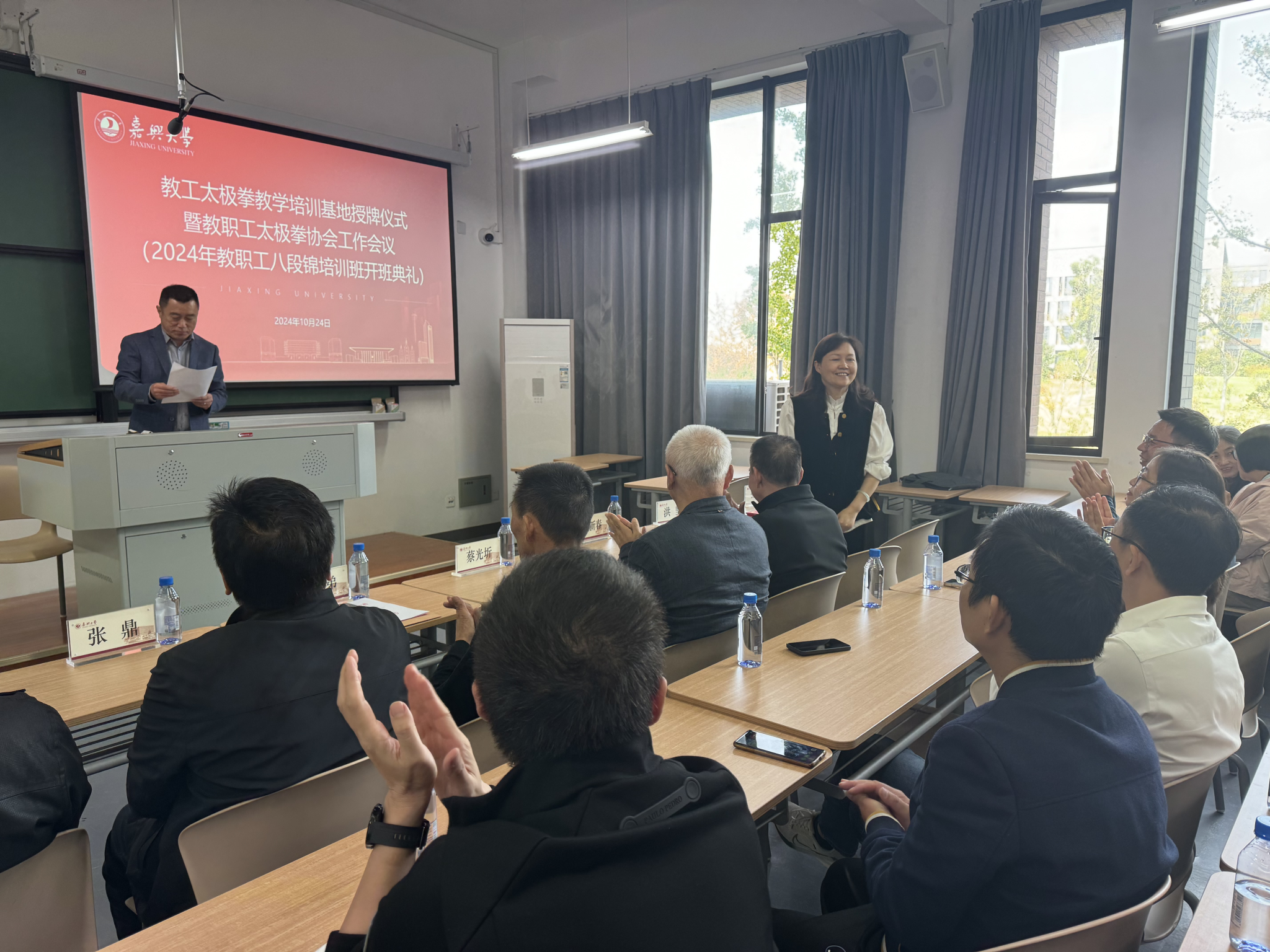 开班仪式上,嘉兴市武术协会为嘉兴大学教工太极拳教学培训基地进行了授牌,校工会还给武术协会相关教练团队成员颁发了聘书。嘉兴大学工会常务副主席洪坚表示,八段锦作为中国悠久的传统健身方式,不仅能够显著增强身体柔韧性、提升整体身体素质,还具备调节身心平衡、有效缓解工作压力的独特功效。校工会希望通过此次教职工八段锦培训班的举办,能够引领更多教职工走近并深入了解这项传统健身瑰宝,共同营造快乐工作、健康生活的氛围。