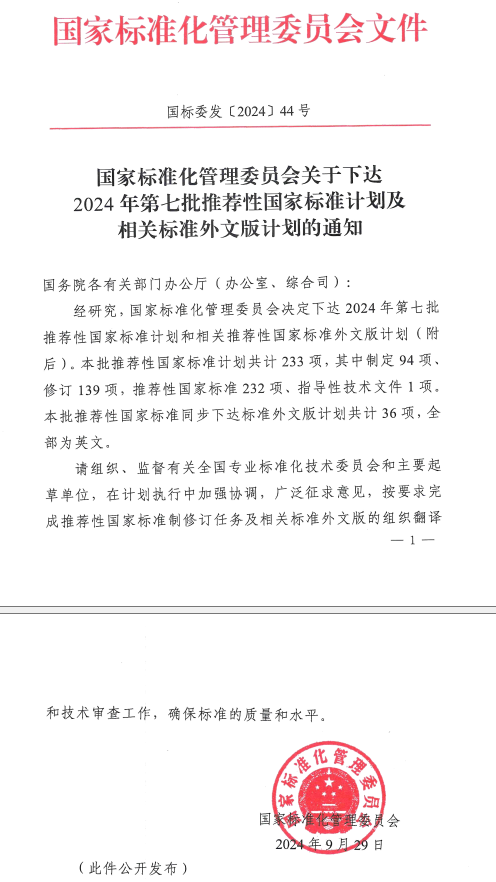 近日,国家标准化管理委员会[2024]44号“关于下达2024年第七批推荐性国家标准计划及相关标准外文版计划的通知”,其中由线上娱乐城