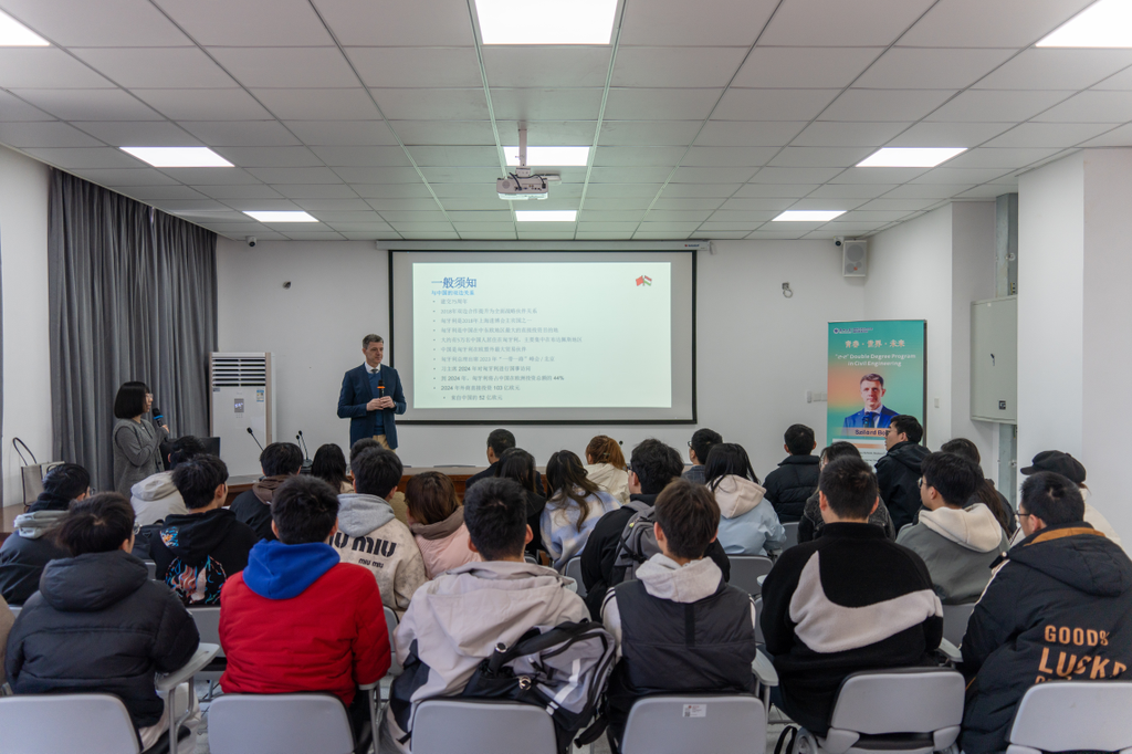 宣讲会上,博岚教授通过详实的数据和生动的案例,系统介绍了匈牙利作为中东欧重要经济体的发展现状,重点解析了中资企业在匈投资的标志性工程项目。针对伊什特万大学土木工程专业的特色优势,博岚教授从“欧洲标准课程体系”、“全英文授课模式”、“校企联合培养机制”三个维度展开讲解,并展示了伊什特万大学的实验室和实训基地图片。在互动环节,土木工程专业2023级学生就学分转换、职业资格认证、硕博深造通道等热点问题与博岚教授展开深入交流。